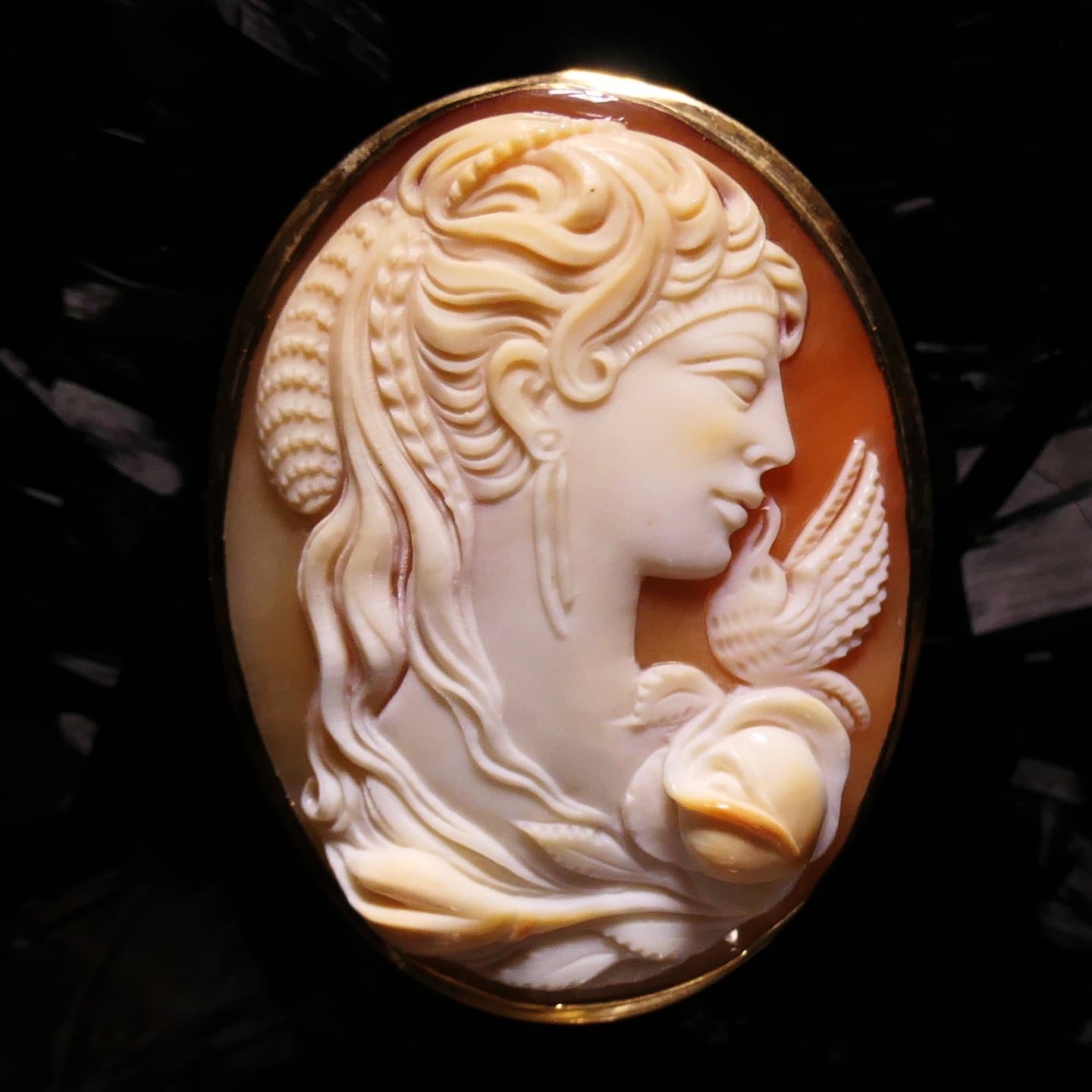 ちなみにマニアックな話ですが、カルロ作でこのような花と鳥をあしらったノトのデザインのプロフィールカメオというのは非常に珍しく、少なくとも日本に多い80年代以降のカメオでは見たことがないので、バリエーションに乏しいカルロ作のコレクションにおいては大変面白い一品となることと思います。