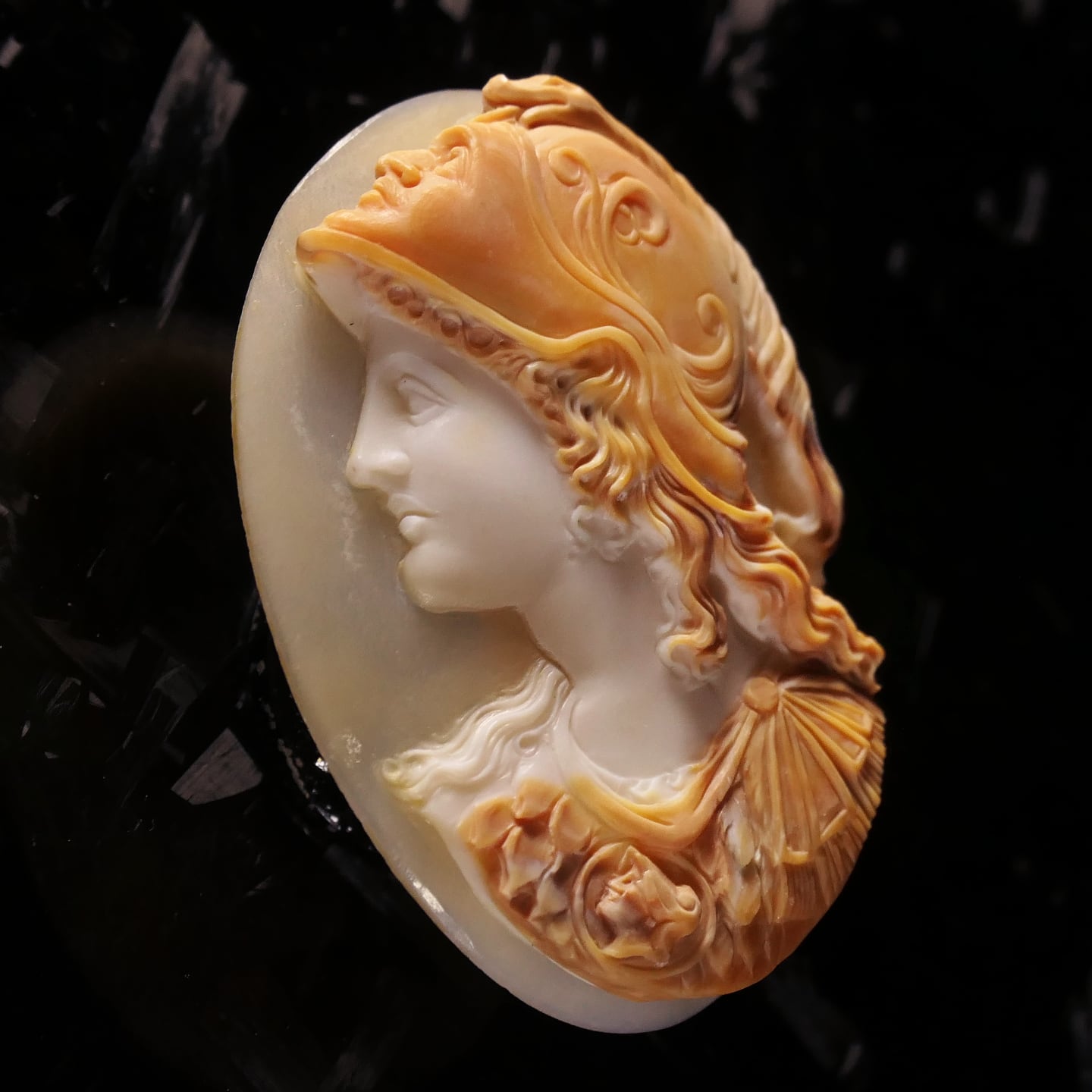 ちなみにこの外唇部の橙色の上層は白色層よりも硬く、精緻な彫刻を施すのは大変な技量が必要となりますが、本作に関しましてはディテールも素晴らしく、兜からのぞく美しい髪や鼻筋の通ったギリシャ的な風貌、マニアックな点でいえば一枚一枚彫られた鎧の小札の形の整い方(幾何学的な模様には作者の彫刻技量が明確に表れる)など、作者の並外れが技量が良く表れております。