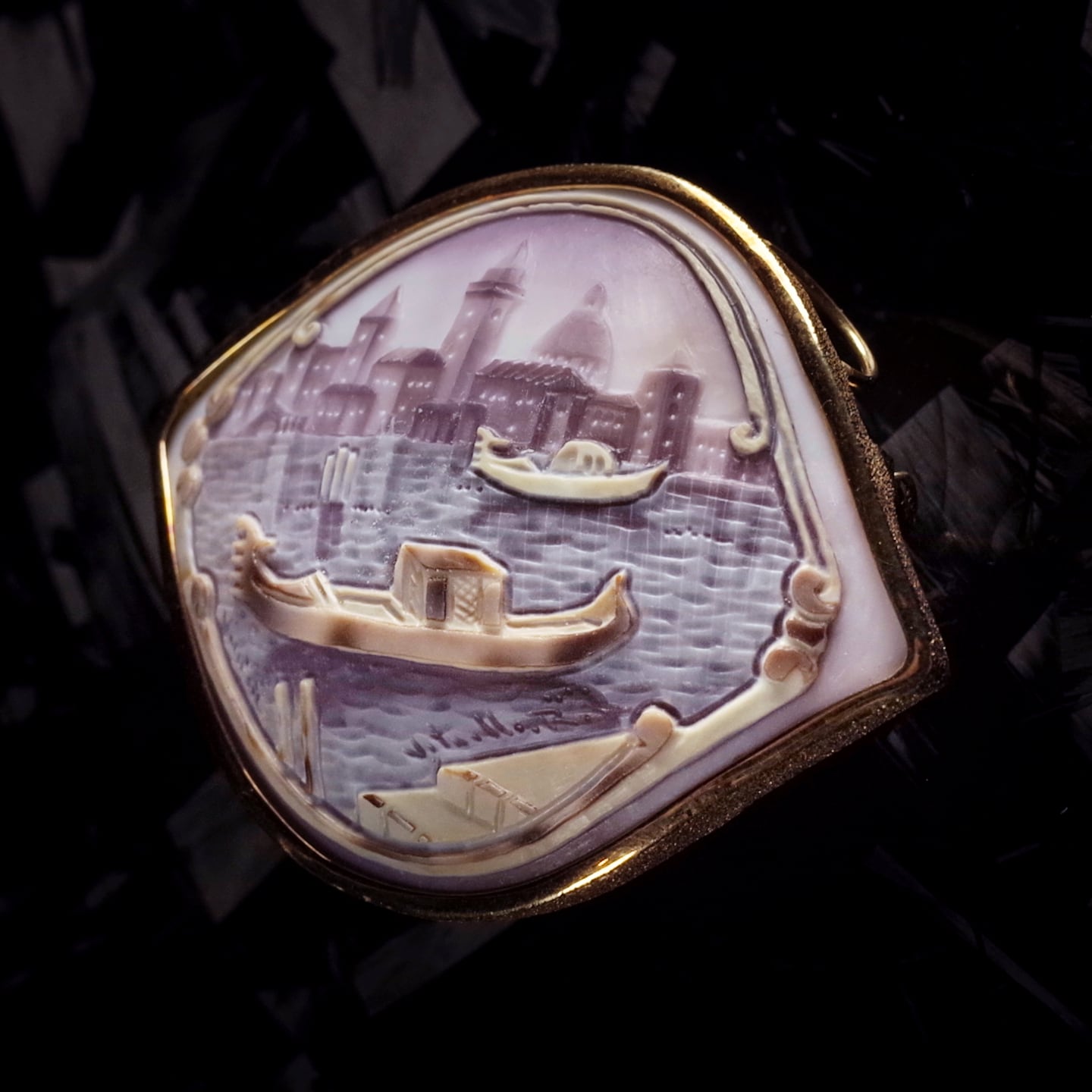 現状風景カメオの作者としてはセルペ氏の良作に次ぐほどに時価が高まっており、50mm規格にも満たないような小さめの風景カメオでもかなり高額で取引されている期待の作家です。