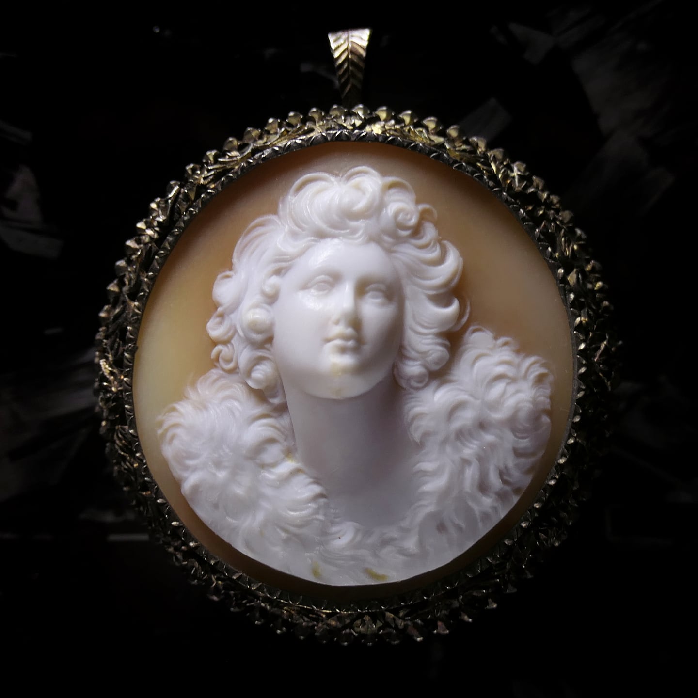 作品としては同時代のマリア同様にノトの技がよく光り、特に毛皮の外套に見える繊細な陰影と白色が地色に溶け込むような貝の濃淡からなされる表現は、ノト作としてはもちろんカメオ史においても20世紀前半までは見ることができなかったものでした。