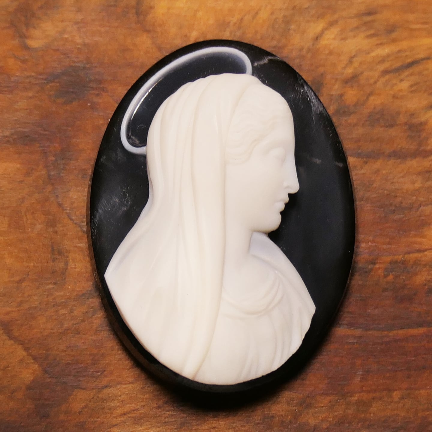 また面白いのが光輪で、本作のオニキスは4色の層で構成されているのですが、実は上のマリア像は一番上の層でできていて、光輪は上から3番目の層で出来ています。