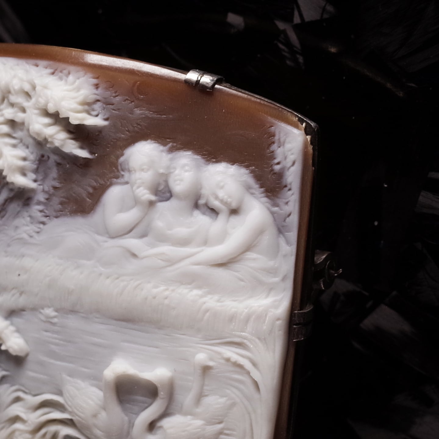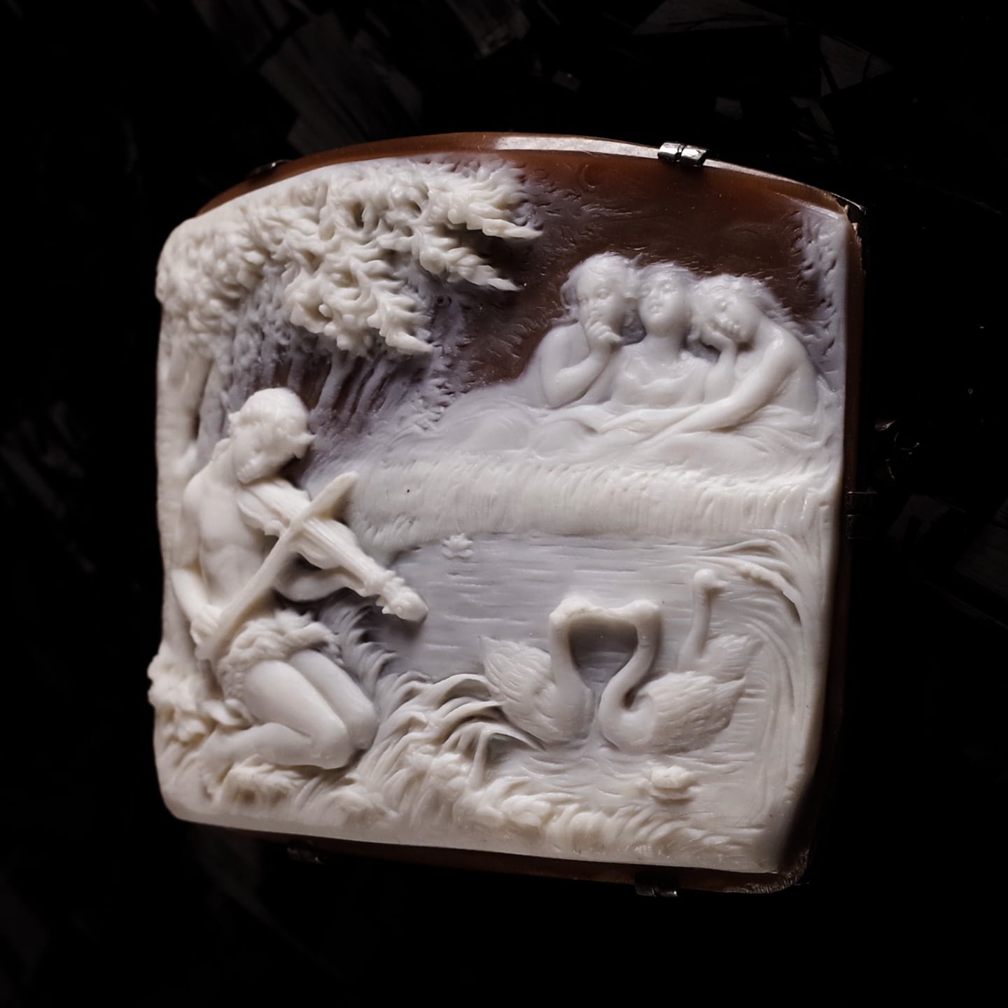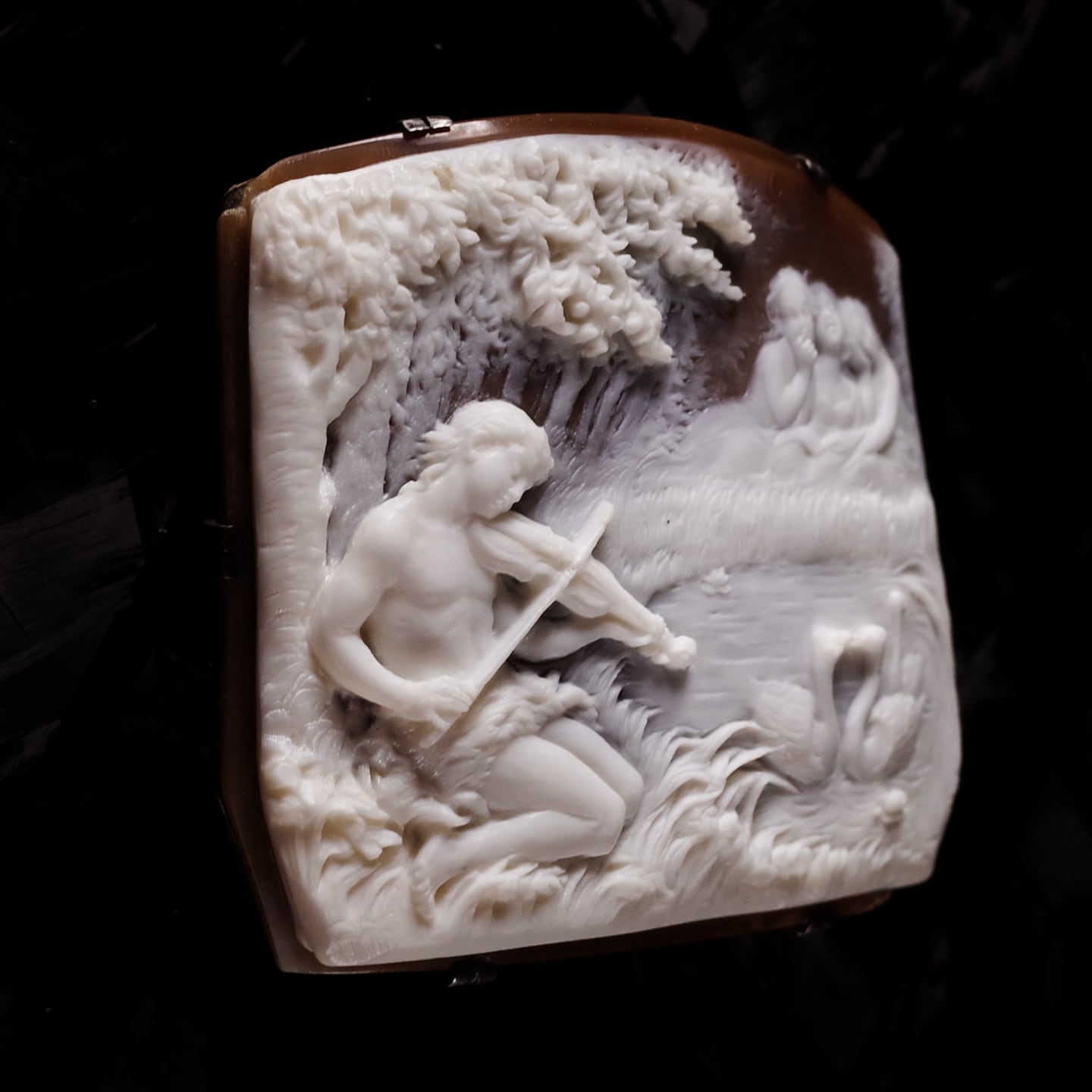 目を閉じてヴァイオリンを奏でる青年の静かな表情やその演奏に心酔するかのような女性たちの仕草や表情もはっきりと描かれておりますが、これらの顔のサイズはわずか3㎜~4㎜しかなく、さすがカメオ史上でも指折りの天才であったノトの手による仕事といったところ。