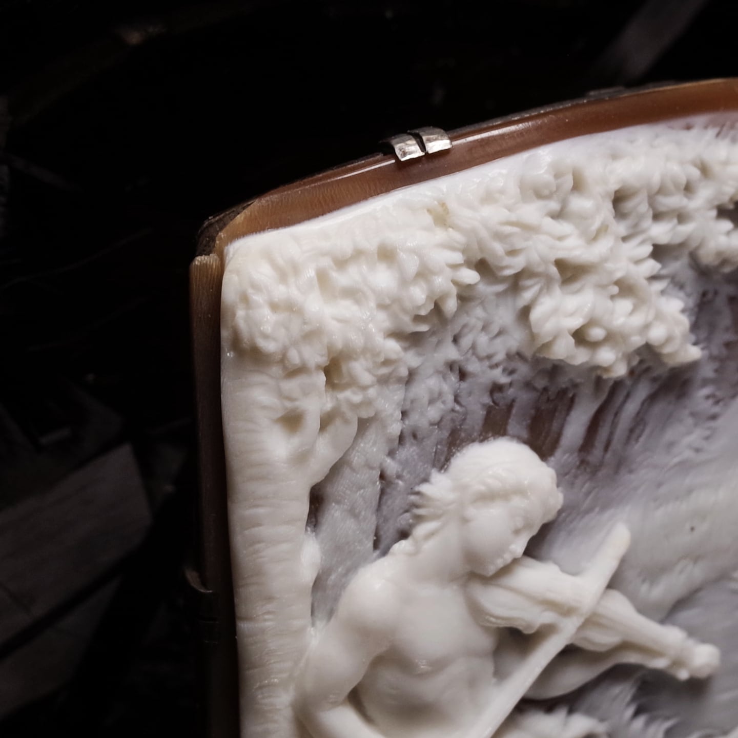 また貝はサルドニクスの外周層部材としては異例なほどに厚く白色層だけで4㎜の厚みがあり、まるでコンクシェルの風景・絵画物を思わせるほどの深い彫り込みとなっている一方で、手前の木立と奥の空気にかすむような木立ではサルドニクスでしか表現できない濃淡の妙が活きており、単純にサルドニクスのシェルカメオとしても手本のような逸品といっていいでしょう。