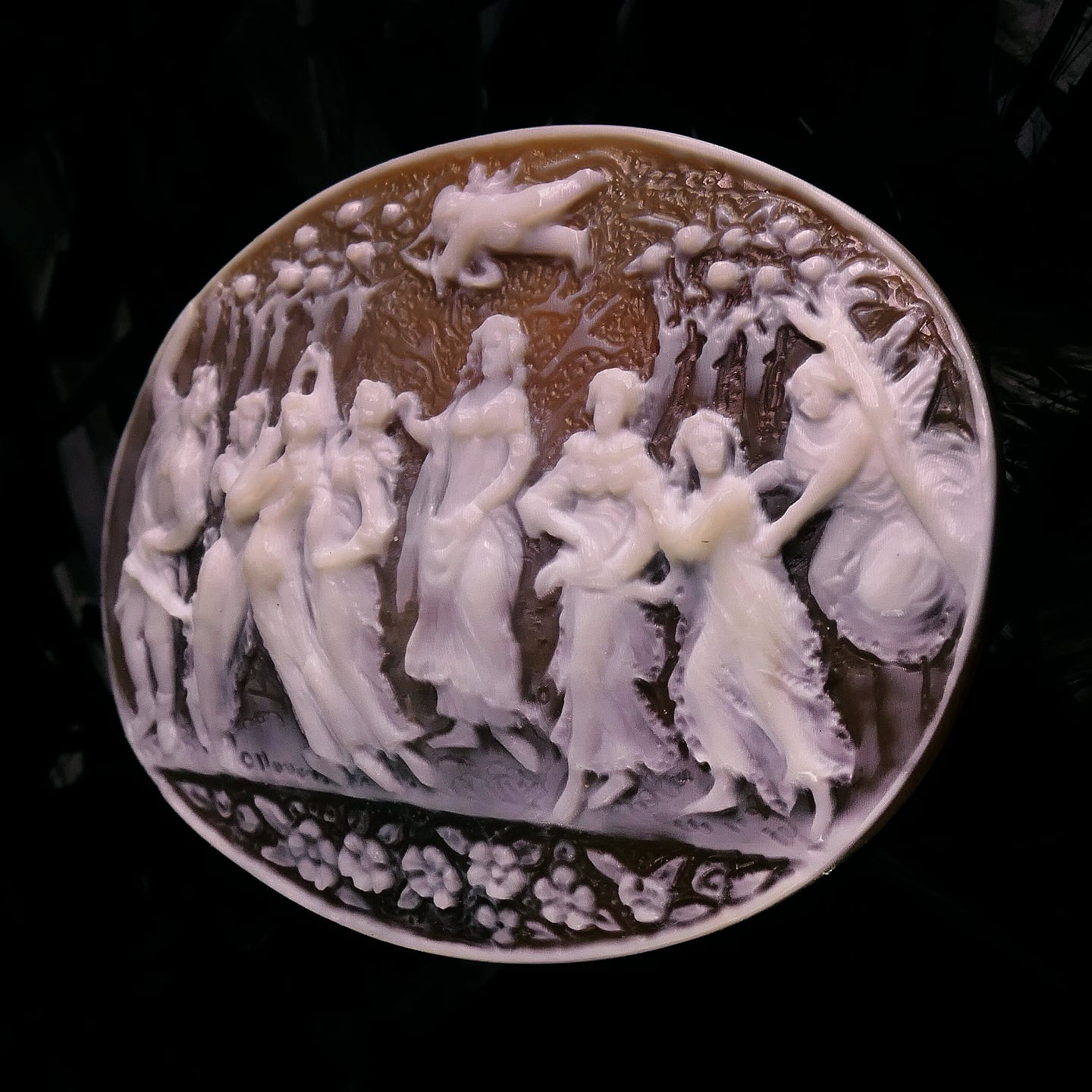 また同氏の細かな彫りも見どころで、代名詞的なレース彫りやわずか2㎜の顔に彫られた目鼻、そして春を描く本作を象徴する画面下の花々などが貝の明暗も巧みに使って表現されており、いかにもオッタヴィアーノ作という仕上がりです。