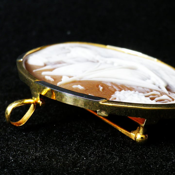 ジョヴァンニ・アメンドーラ氏は日本でも非常に人気のある作者で作品も多く見かけますが、その殆どが風景、絵画調のカメオで人物よりもむしろ馬を多く彫り、その頻度は出来の良い馬のシェルカメオをみたらアメンドーラ作といってもいいほどです。