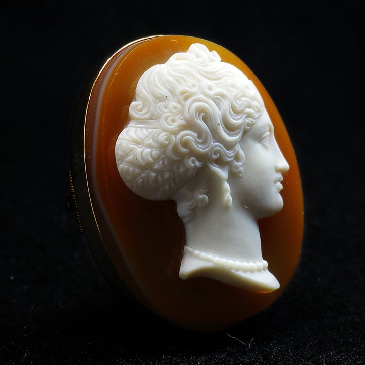 ハードストーンカメオというのは、一般には柔らかい凝灰岩(ラーヴァ)に対して硬度が高いメノウを用いたカメオになります。