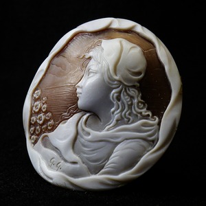 ガロファロ氏の”G.G.”銘のカメオに典型的な布状の枠をとったポートレートで、カメオにそれなりの投資をなさる愛好家の方にはもはや多くを語る必要もないかと思います。