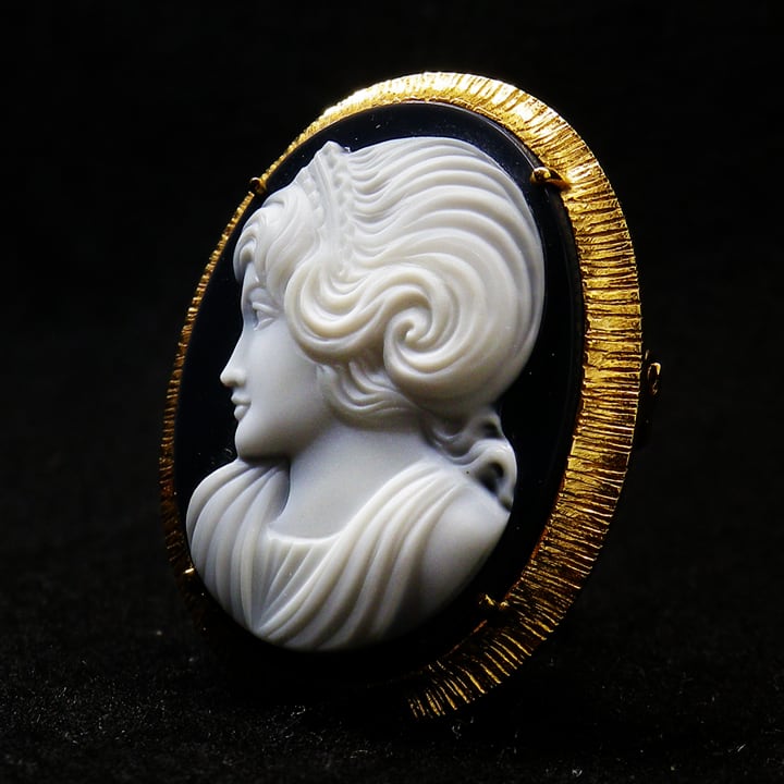 70年代といえば機械彫りカメオが実用化され始めた時期ゆえに年代自体は手彫りの証拠とはなりませんが、機械彫りには無い背景部の研磨と色層に合わせたうねりが見られることから、本作が手彫りによるものとわかります。