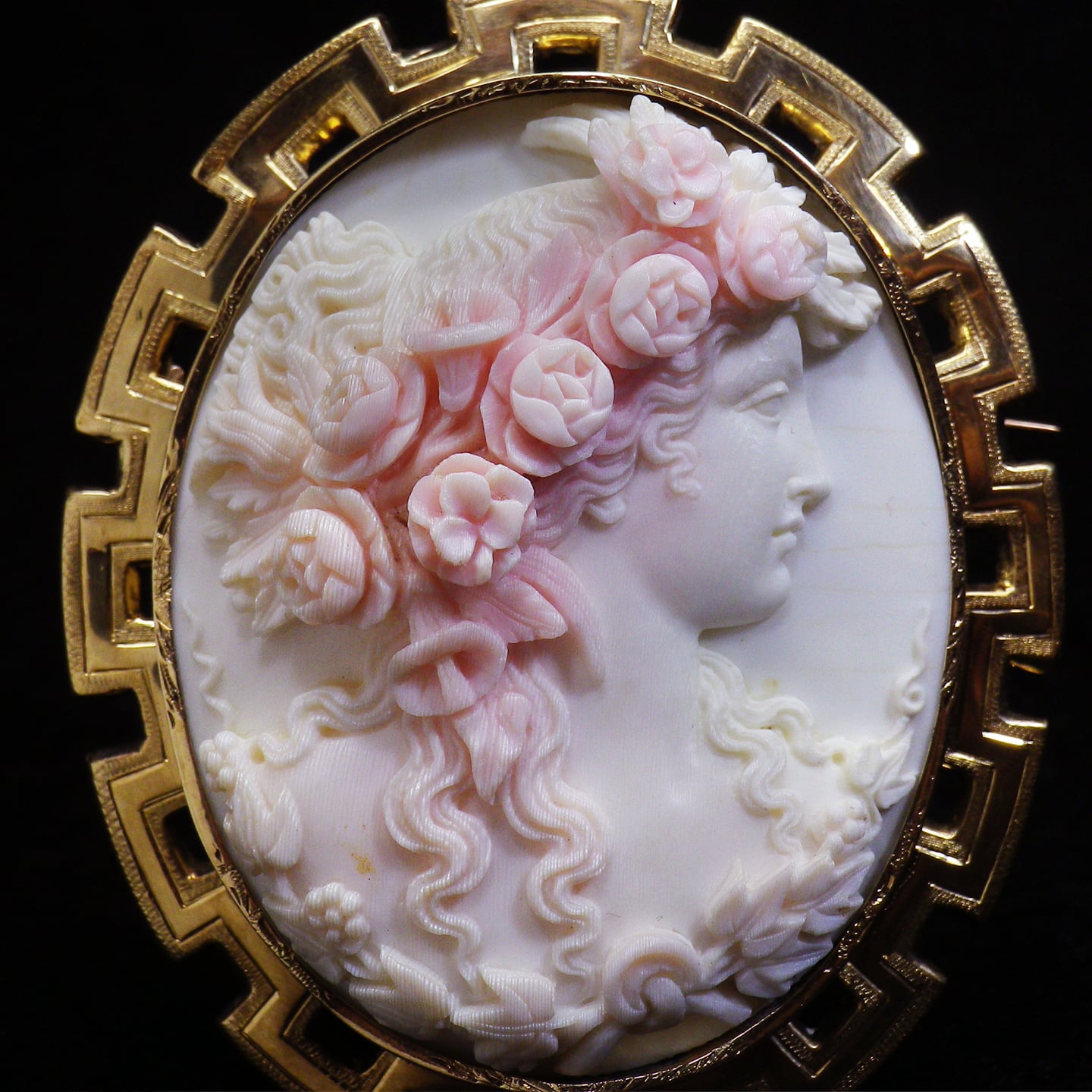 しかもそのピンクとクリーム色がかった白色のコントラストで表現されるのは、無数に存在するカメオのモチーフの中でも最もその色合いと相性がいいフローラ像です。