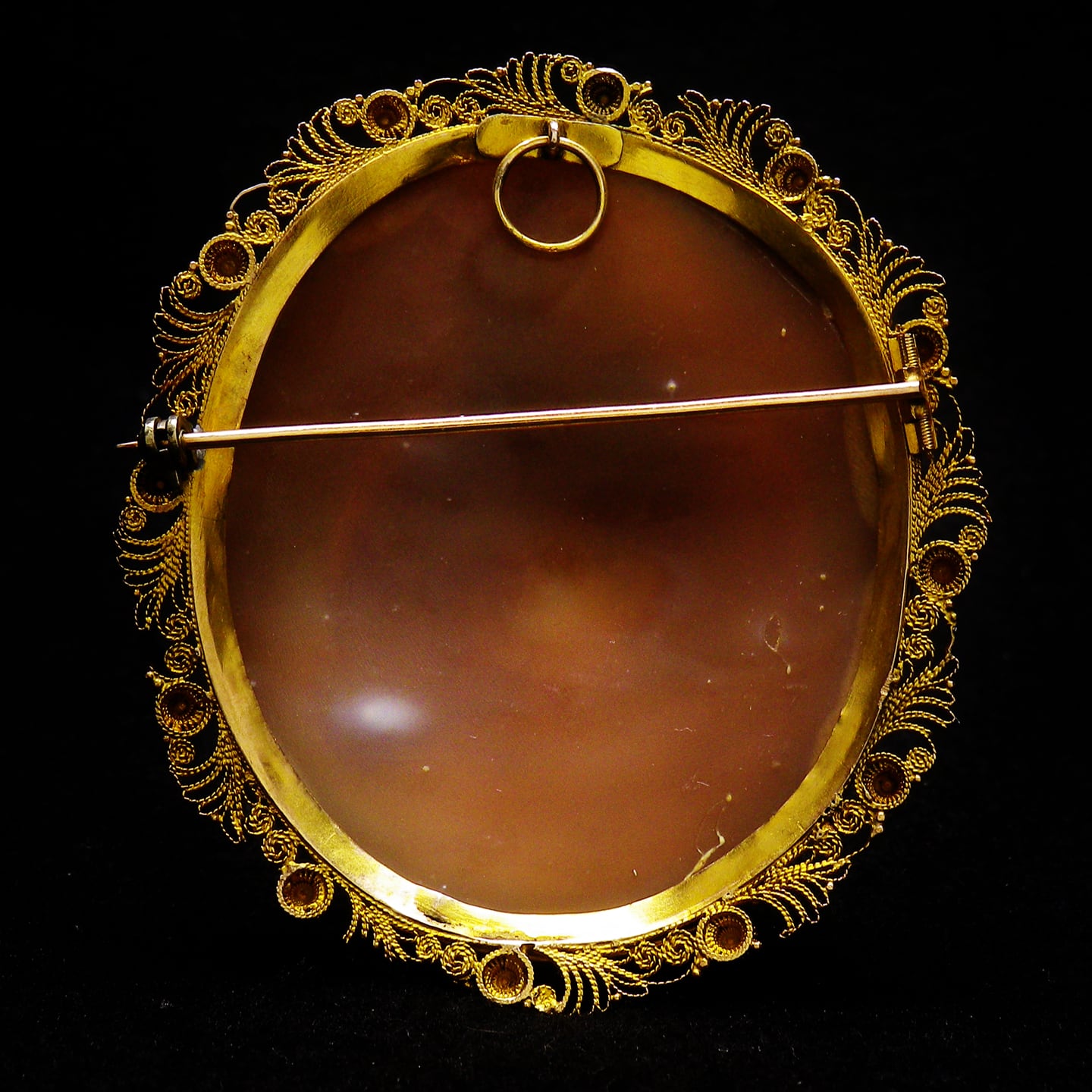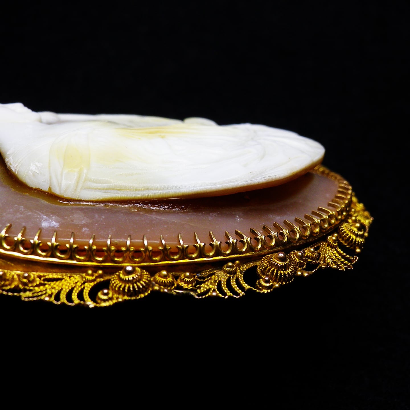 彫りも高く立体的で、多少像に貝の淡褐色が乗っておりますが、色を絶対視せず彫刻性を重視した姿勢は、当時最高の彫刻師のひとりであったサウリーニの作にも頻繁に見られるように、モダンカメオにはないアンティークカメオ特有の視点によるものといえましょう。