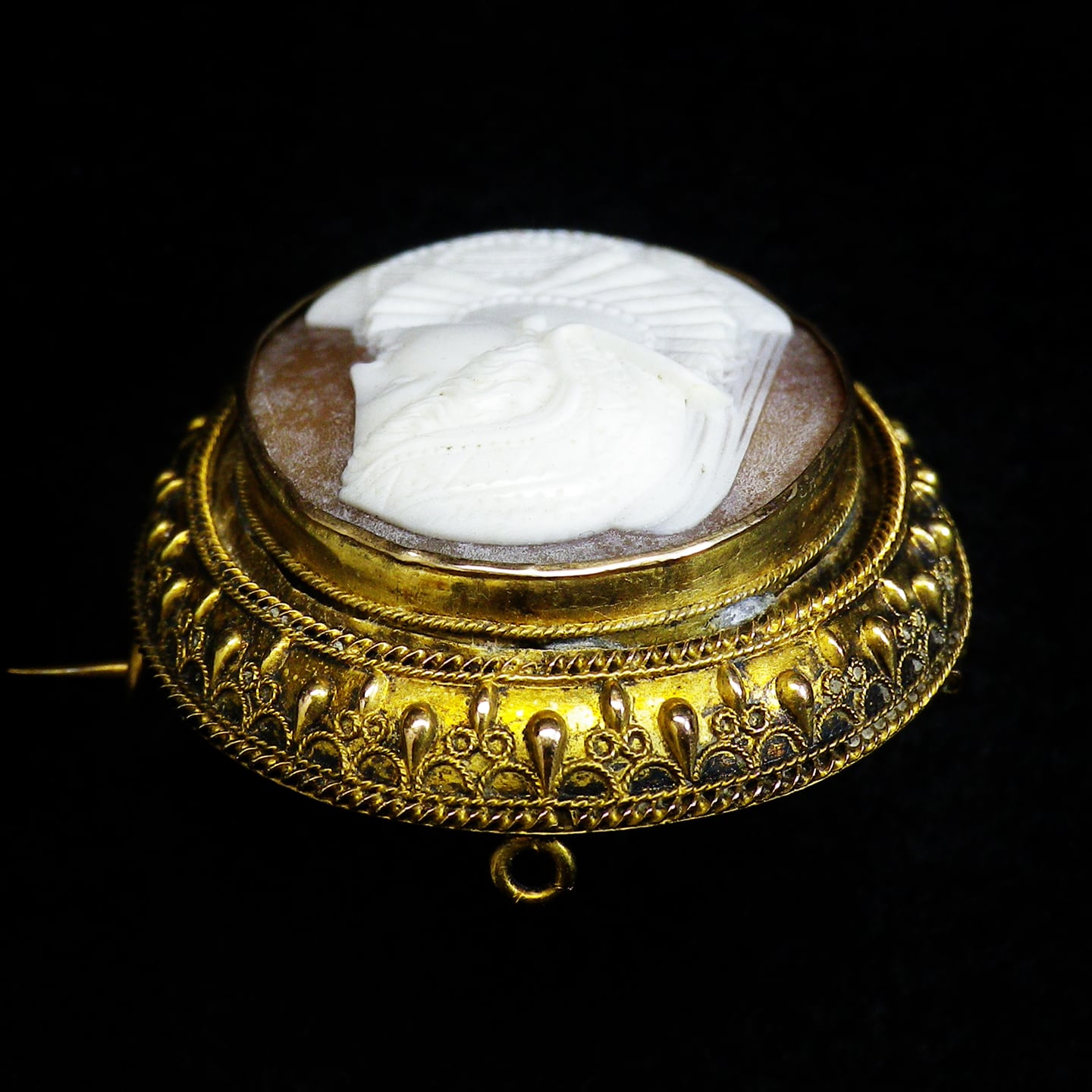 今回のお品物もまさにそうした中のひとつで、14ctないし15ctの金によって作られたエトルスカン装飾の美しいフレームに収められているのが典型的な逸品。