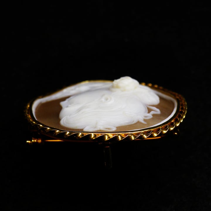 先述のように貝の厚みを活かした構図を補助するように前面に比重を置いた造りをしており、カメオの美しさを引き立てる良いフレームです。