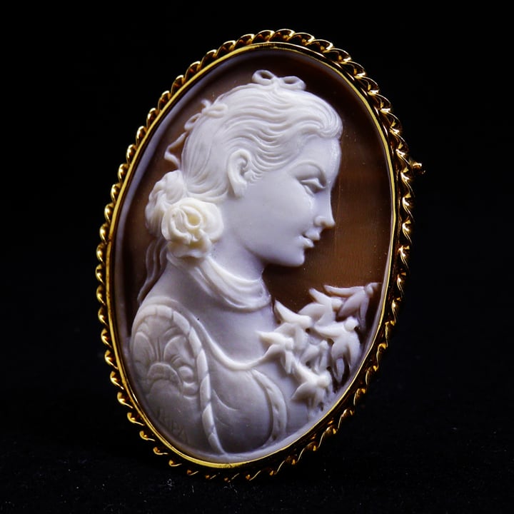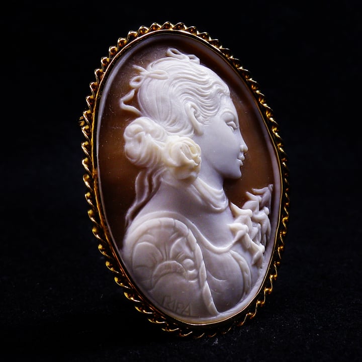 さまざまな作者から学んで取り込むというリーパ氏の作品の面白さといいましょうか、顔の特徴的な柳眉はモダンカメオの始祖にして不朽の巨匠ジョヴァンニ・ノト氏を基とする一方で、髪の感じはパスクアーレ・インジェニート氏の作を、服の装飾などからはエンツォ・チリッロ氏の作品を彷彿とさせ、それらをリーパ氏の迷いのないはっきりした線で見事にまとめ上げた一品となっております。