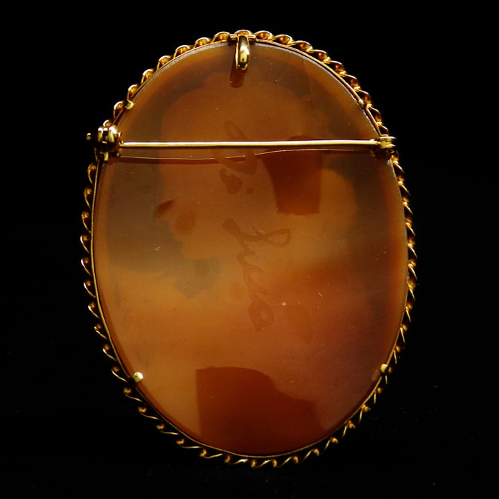 モチーフの人物は首にスカーフを巻き、カメオによく見られる雰囲気よりは近代的な感じがあります。