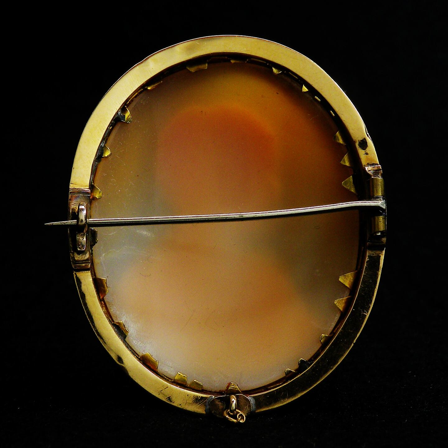 キャッチも当時のC型クラスプで、ピンはカチっと留まり、フレーム下部には脱落防止のためのチェーンをつけるカンも装備されており、当時の金細工職人のこだわりを感じさせる作りです。