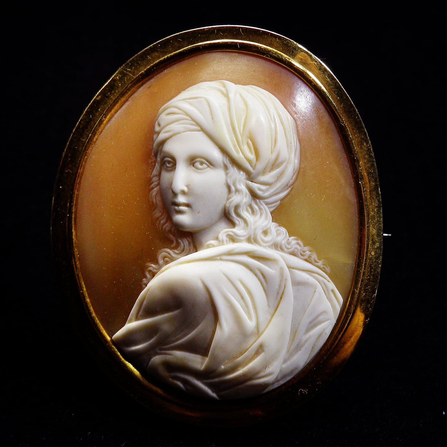 柔らかいコルネリアンの橙色を背に振り向いてみせるベアトリーチェの顔は生気を持ったように美しく、時を経てなめらかなつやを持った貝の質感がはりのあるうら若い女性の肌を上手く表現しております。