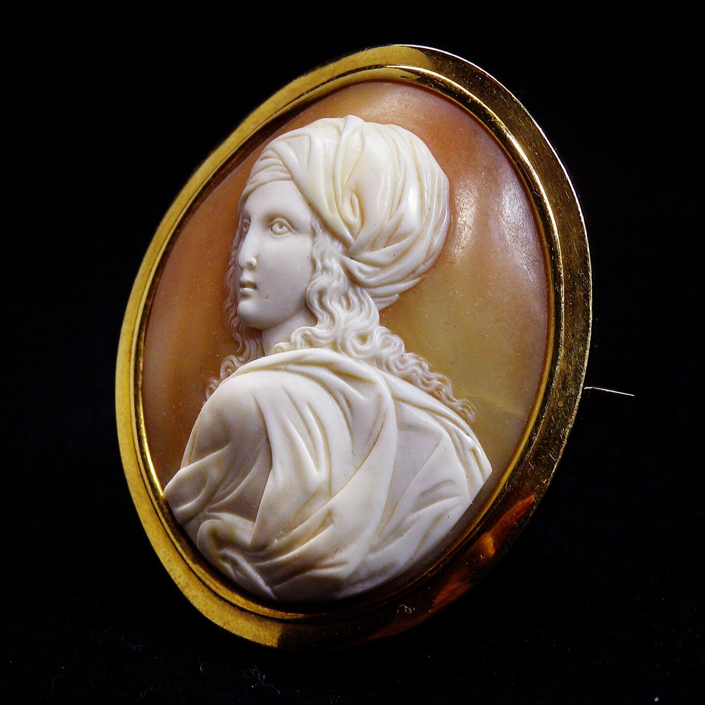 古いカメオは彫刻刀の後を残さず綺麗に磨きをかけているものが多いですが、そこからさらに時間をかけて完成した、アンティークならではの名品のひとつと思います。