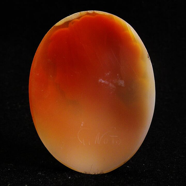 ラファエレ・パルラーティ作のカメオの裏にノト氏のサインがあるのは本作以外でも見たことがあり、現在もエンリコ・ペルーソ氏のカメオの裏に師であるラファエレ・ペルニーチェ氏がサインを入れていることがあるように、師が弟子の作品の品質を保証する意味で入れられた物である可能性がありますが、一方でマリオ・ヴェントレスカ氏やアンドレア・スカーラ氏といったノト氏の作風を色濃く受け継いだ作品を作っていた作者のものを含むその他の作者の作品にノト氏のサインが入っているのは現在確認しておらず、そのあたりの詳細は今後の研究課題のひとつでしょうか。