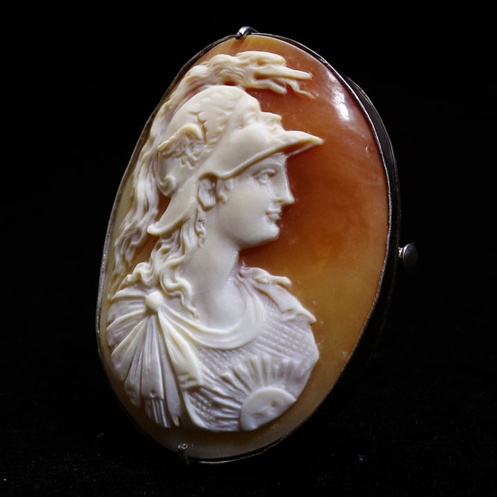 元々カメオのモチーフとしては難易度の高いものゆえにひどく出来の悪い作品は見かけないタイプの作品ではありますが、その中でも整った顔立ちにバランスのいい構図、西洋的な竜を象った兜飾りの表現と対するような肌や甲冑のなめらかな仕上がりと、質のいいカメオとしてまとまっております。