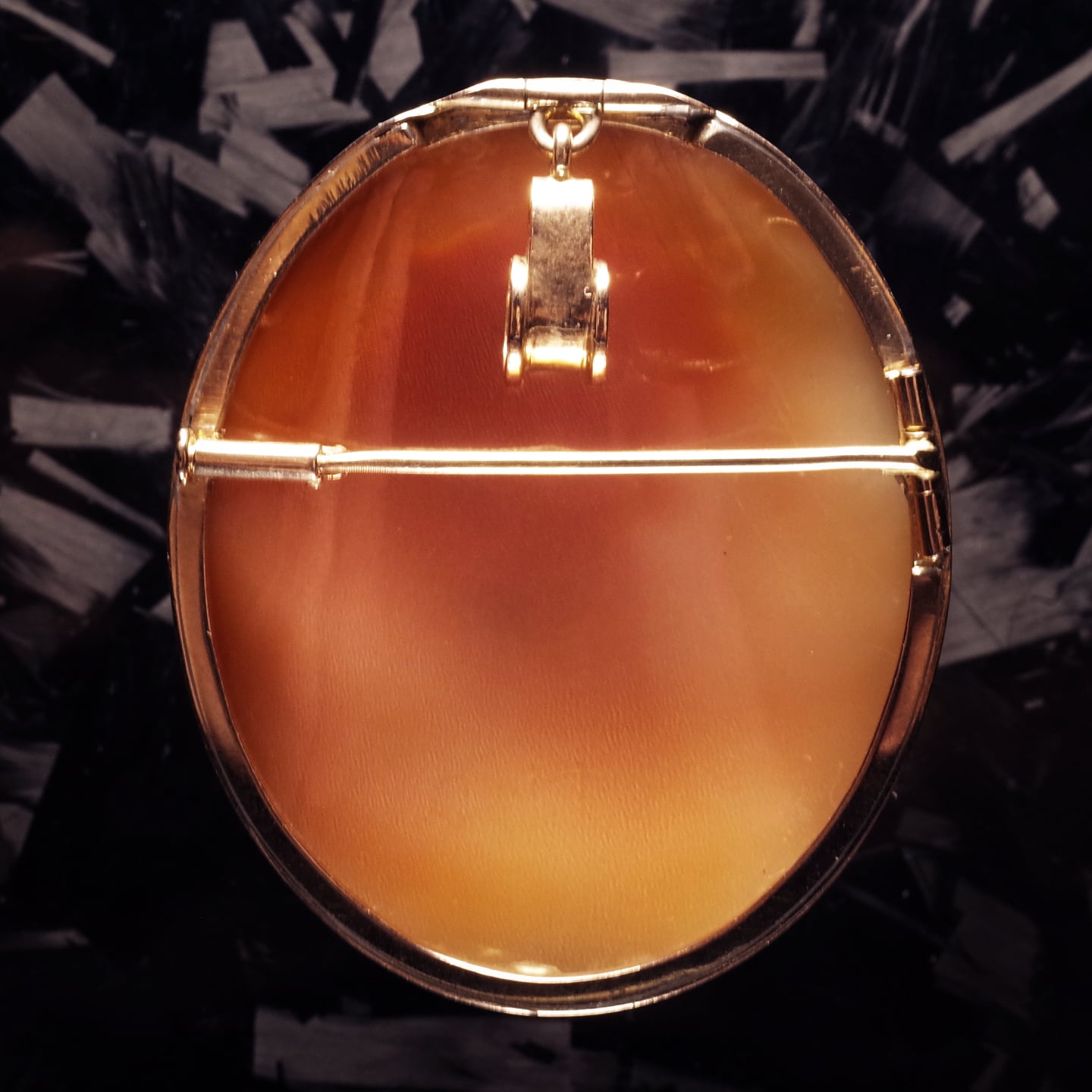 色も通常多くのコルネリアンのカメオが画面右側に朱色、左側に淡黄色とグラデーションがかかるのに対して本作はグラデーションが弱く、全体的にかなり色の濃い背景層を持っているのが分かります。