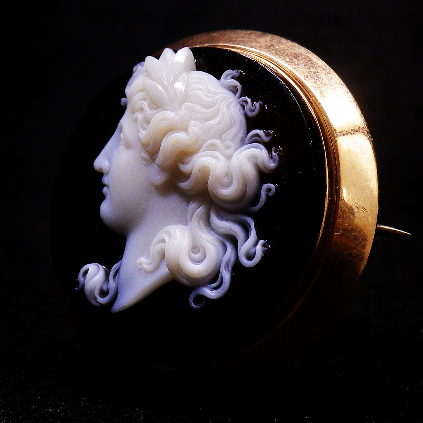 母材はスモーク状の地のメノウが比較的多く、色調的なコントラストに富む素材はさらに貴重になるのですが、本作は濃褐色のサードニクス(シェルカメオに使うクチグロトウカムリをサードニクスシェルと呼ぶのはここからの転化である)で、素材から彫りまで当時の最高品質となるカメオです。