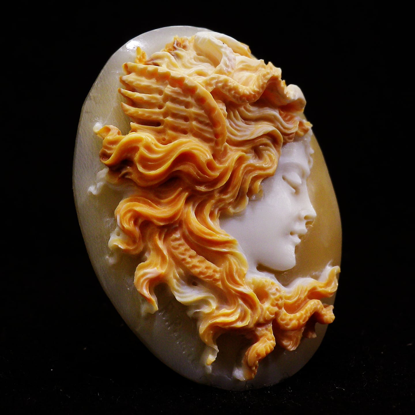 19世紀のメデューサのカメオは表情に険しさが無く静かに目を閉じていることが多く、現代のものは怪物然としたものが多い傾向にありますが、本作は現代的で華やかな彫りと表現でありながら、穏やかで眠るような表情をしている点が印象的。