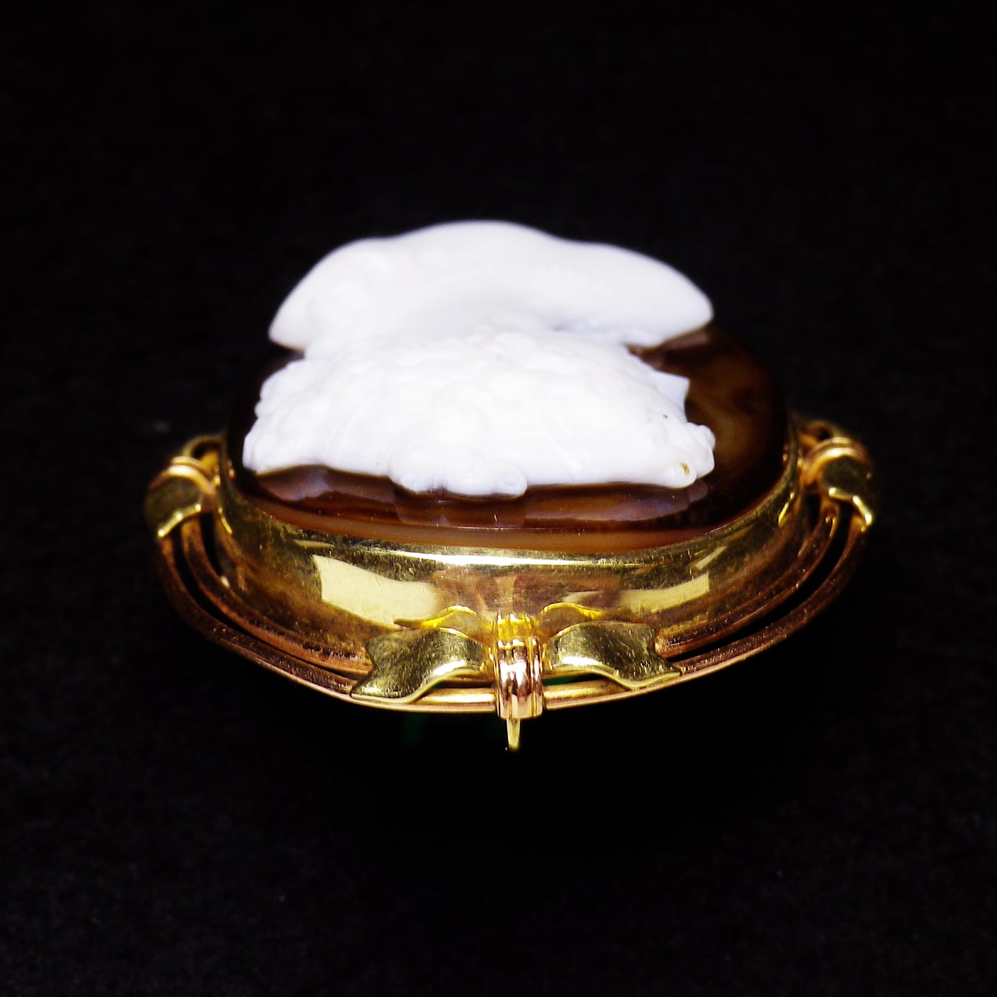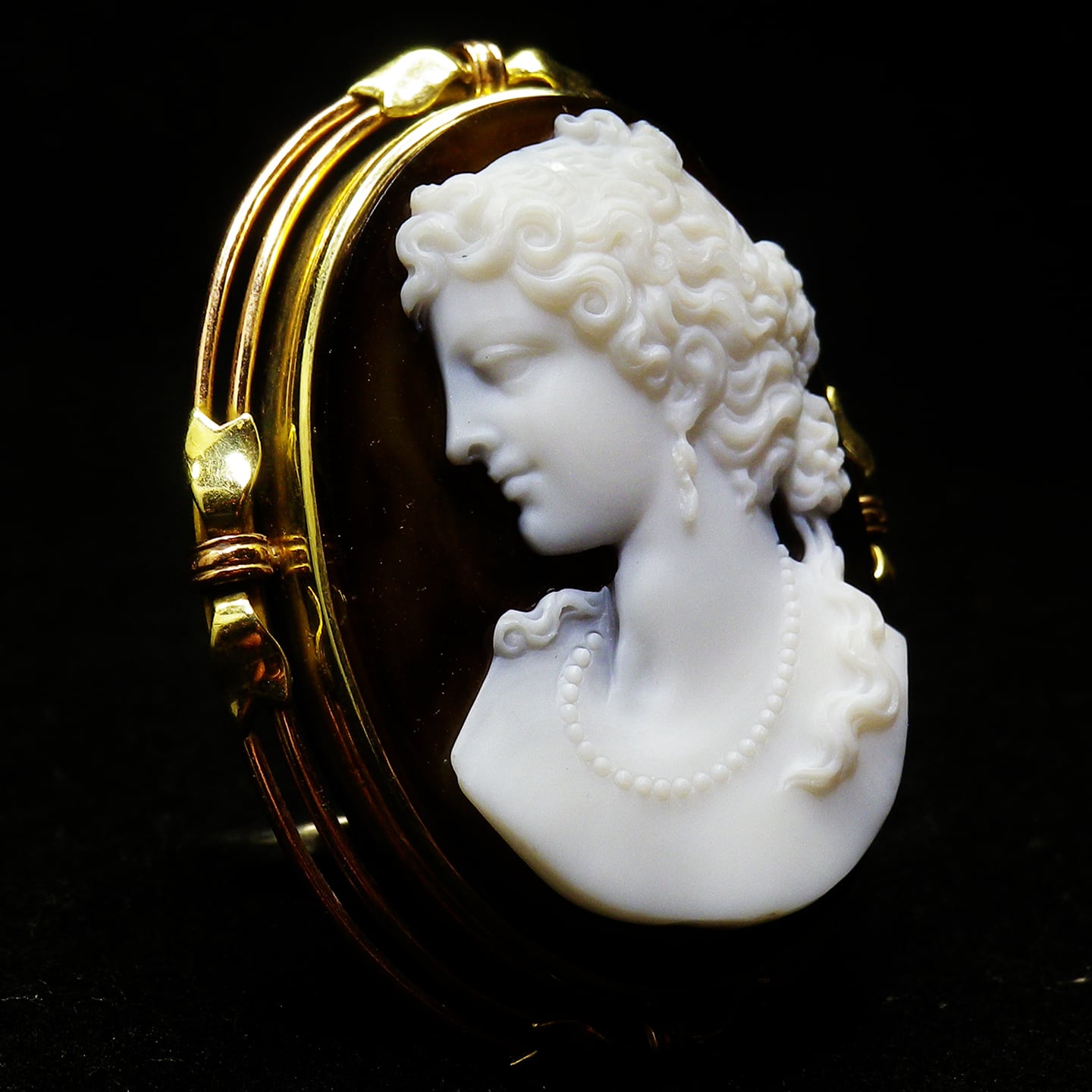白色層が薄く像に高さが無いことが多いサードニクス・オニキス系のカメオとしては像も高く、また3.8mm(1.5インチ)を大きく上回る大粒のカメオであることとフレームも当時のものが比較的綺麗な状態で現存じていることも手伝い、総じて希少性と質の高さとを兼ね備えた逸品といえましょう。