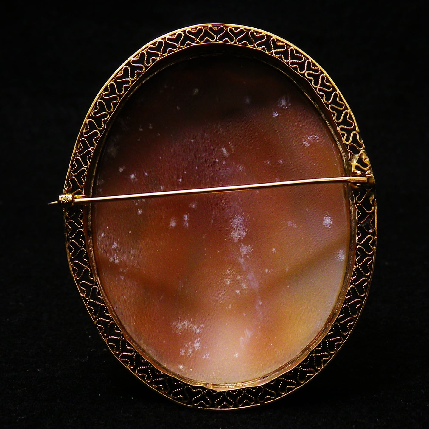 20世紀前半のアールデコ期特有のフレームで、このフレームに良質のカメオが収まっていることなどほとんどない(知っている中では初期のノトの作品でリンドバーグの大西洋単独横断記念の作品がいくつかあるのみである)ので、フレームも併せて大切にしていくのが望ましいと思います。
