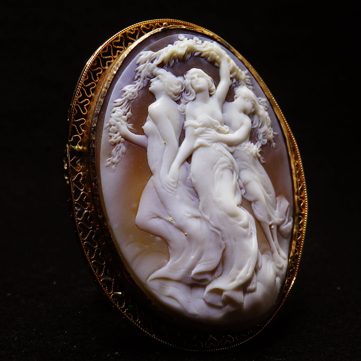構図も古く、こうした頭上にリース・ガーランドを掲げたものは20世紀の前半まで多用されたもののその後は見ることがなくなってしまった古い時期の三美神に特有のもので、現在はボッティチェリのプリマヴェーラに描かれる三美神がモデルとなっているものばかりのため、この構図で美しいカメオとなるとほかに見ることすらできません。