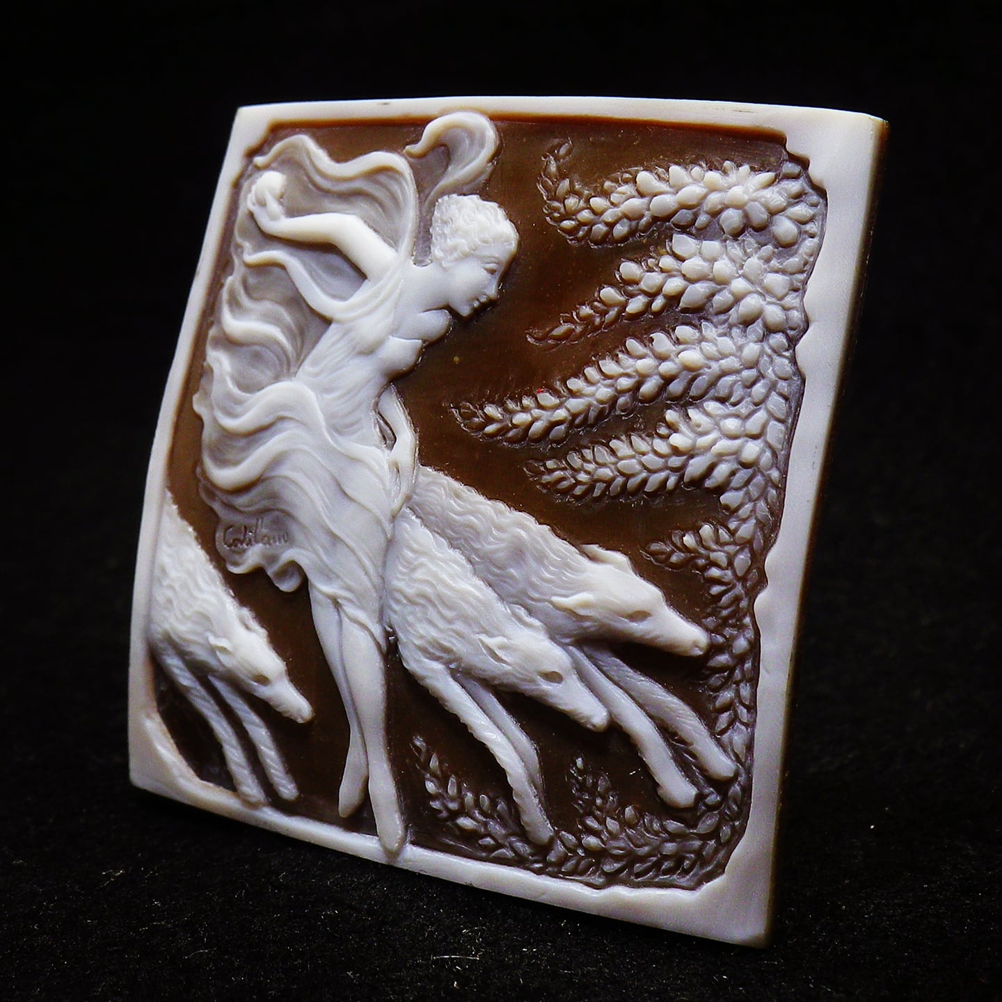 ただスカーラ派(そう呼べるほどスカーラ氏の作風は特徴があり、それを受け継ぐ作者も多い)の作風だけが見どころかといえばもちろんそうではなく、画面右の草葉の細やかな描写、狼の毛並み、そして軽やかに表現された半透明の布、それに構図的にも周囲の枠から精霊の服と足先を出して画面に奥行きを持たせる工夫をこらすなど、現代のカメオらしさを出しつつ、そのなかでも見どころの多い作品となっております。